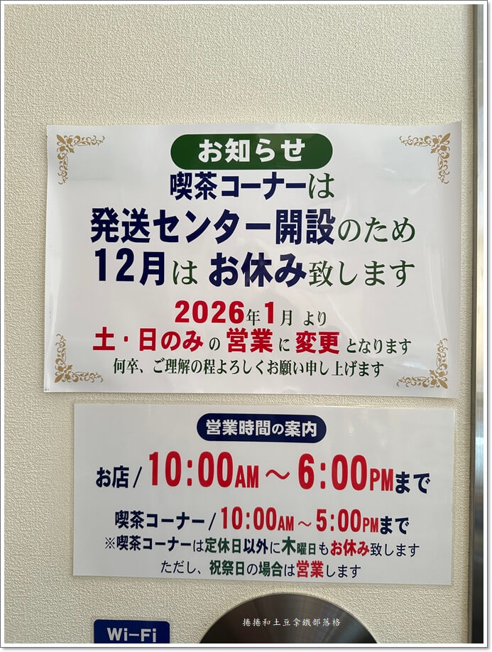 喫茶 (內用咖啡角) 大約是 10:00–17:00 (但喫茶角週一和週四公休)