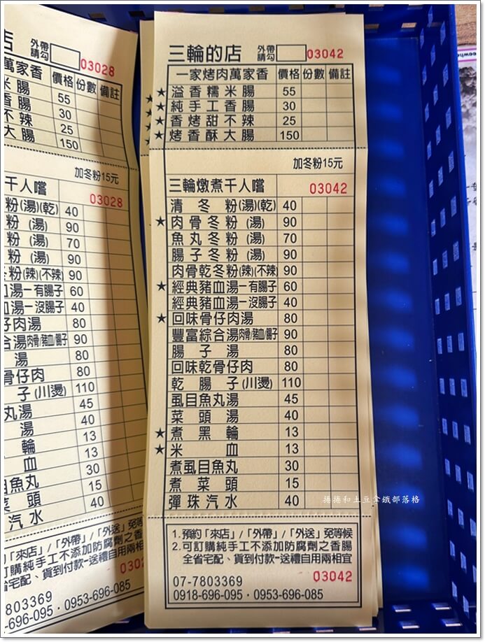 除了提供一般常見的大腸香腸、烤黑輪外,比較特別的是有少見的【肉骨冬粉】、【豬血湯】、【香烤大腸頭】。