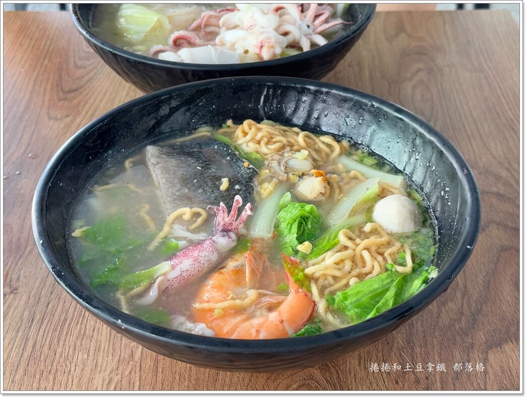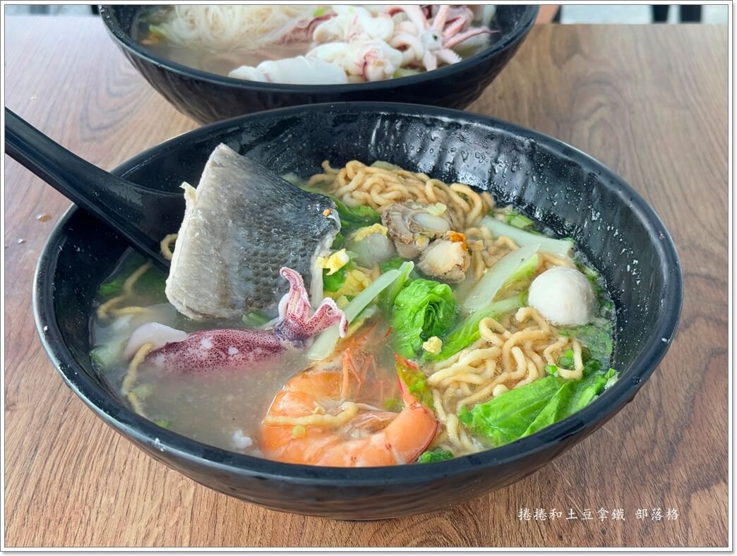 蝦子、虱目魚肚小片、小隻的小卷、小魚丸、小帆立貝、白菜通通給滿,湯頭喝第一口就知道是有認真在熬的那種。加上意麵浸泡喝來更清甜順口。