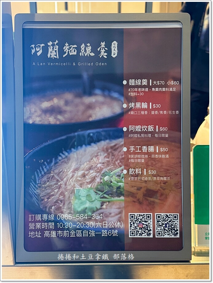 這間叫做阿蘭麵線羹,2026年1月5 日開幕,地點在前金區自強一路6號,靠近中正路,捷運橘線前金站1號出口正對面,旁邊就是星巴克,非常好找。