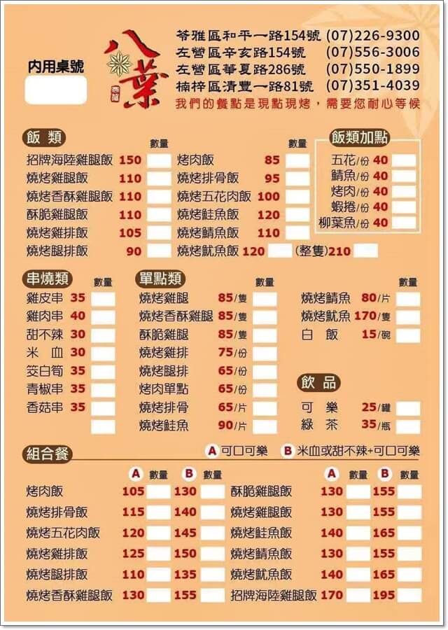 位在和平路上,就在文化中心、高師大旁邊的「八葉燒烤雞腿飯」,每次從店門口經過,看到店家把雞腿烤得油亮,就覺得好好吃的樣子。而且從外觀上看起來,覺得店家把整個店面,裝潢得跟一般賣雞腿便當的店完全不一樣,也算乾乾淨淨的。