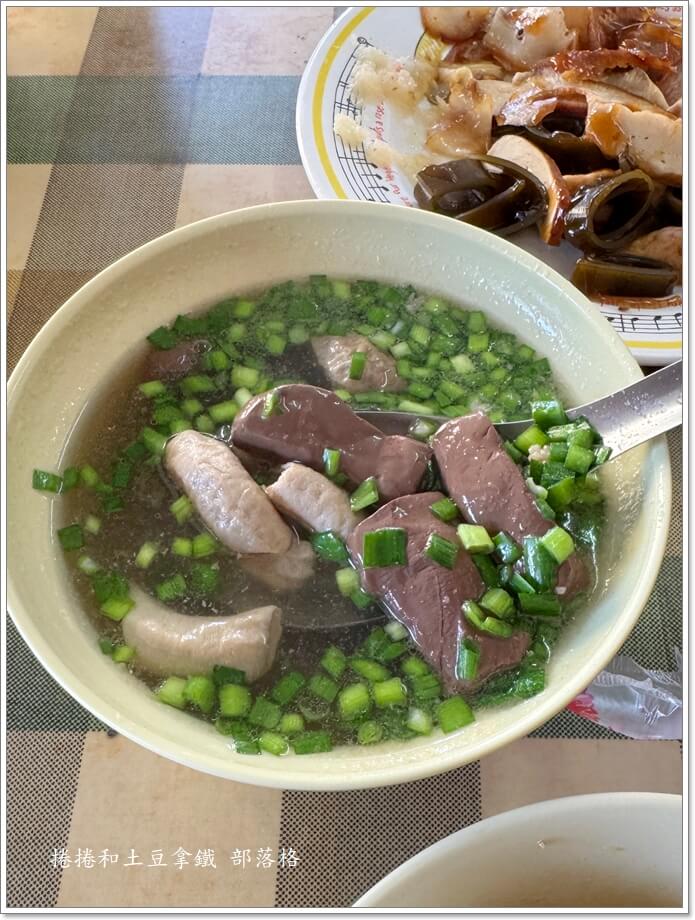 豬血大腸湯。湯品帶著一點甜味與清香,豬血細嫩且大腸有嚼勁,湯頭清澈但富層次,清淡卻不無味。韭菜放好多,幾乎整晚湯都被覆蓋。