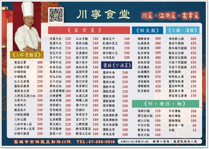 位在高雄前鎮區好市多斜對面的君毅正勤社區,有間【川寧食堂】是一間供應川菜料理、江浙菜、家常菜、各式熱炒等多元化的餐點,菜色種類眾多,非常適合聚餐的餐廳。搭輕軌在經貿園區站下車,走路5分鐘即到。店前的正勤路,路邊停車格還算好停。