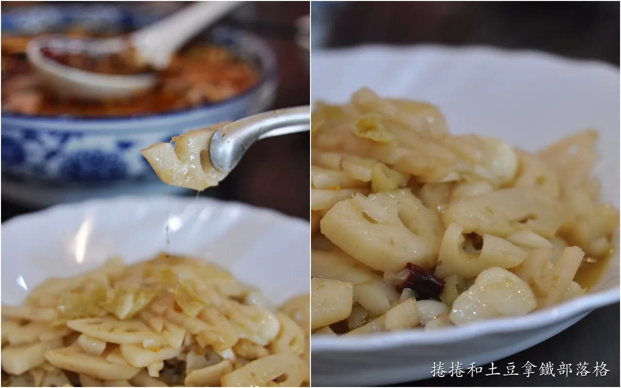 野山椒是一種小型的辣椒,辣度偏高、外皮脆嫩,與鹽水、白醋、花椒、薑蒜一起發酵,再跟厚切的蓮藕片爆炒。如果前面沒有吃其他辣味菜餚第一口先吃這道的話,酸度強烈,味道的變化會從酸→麻→辣→酸,但如果前面已經有吃其他麻辣菜餚,再吃炒蓮藕,酸度就會減弱,反而增添一點清爽解膩的作用。