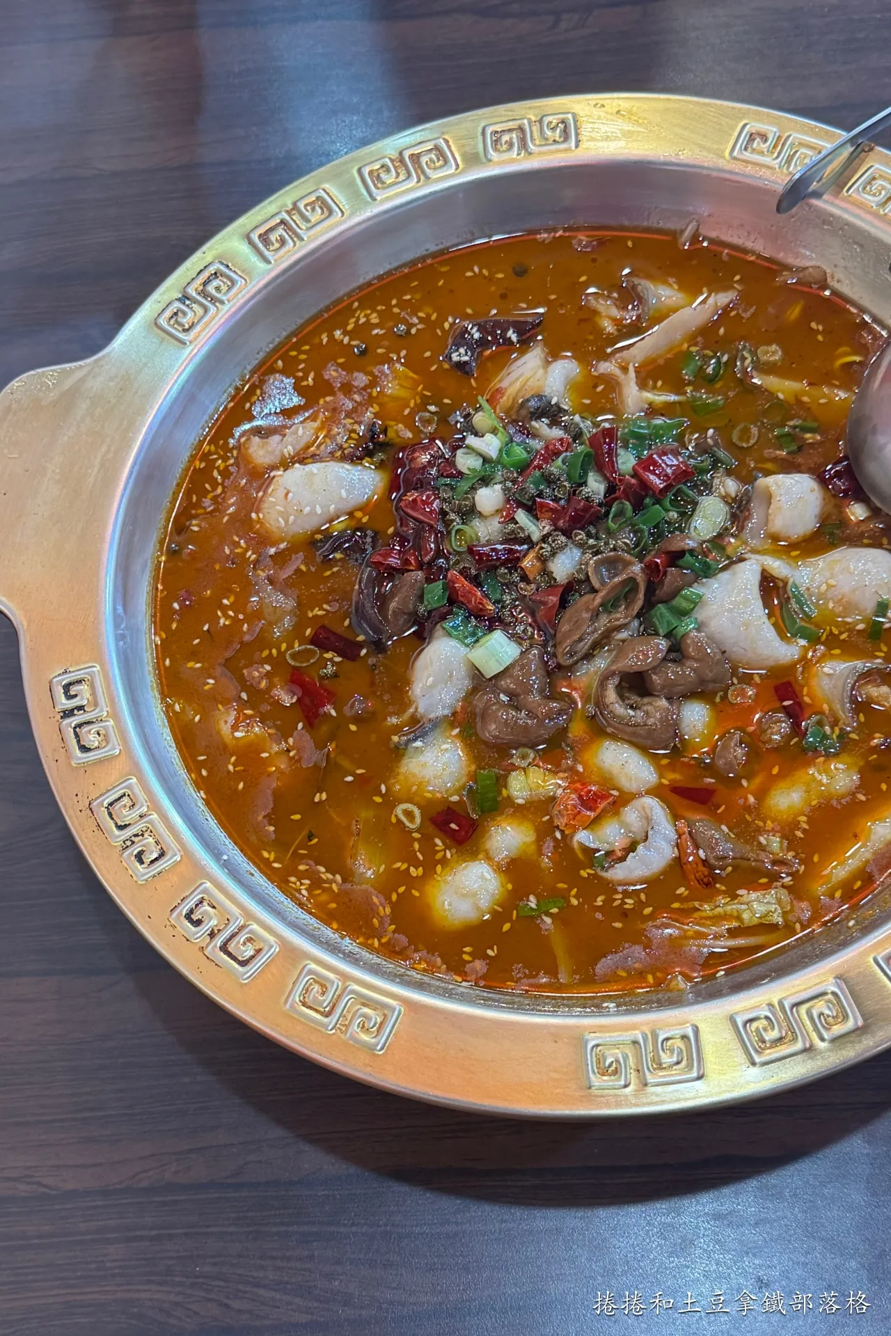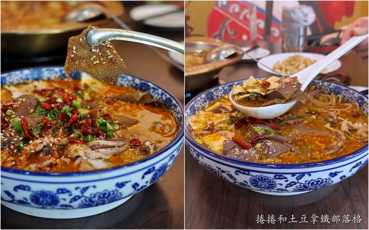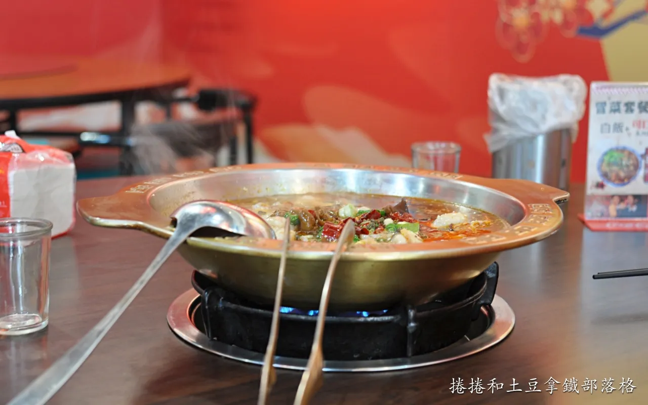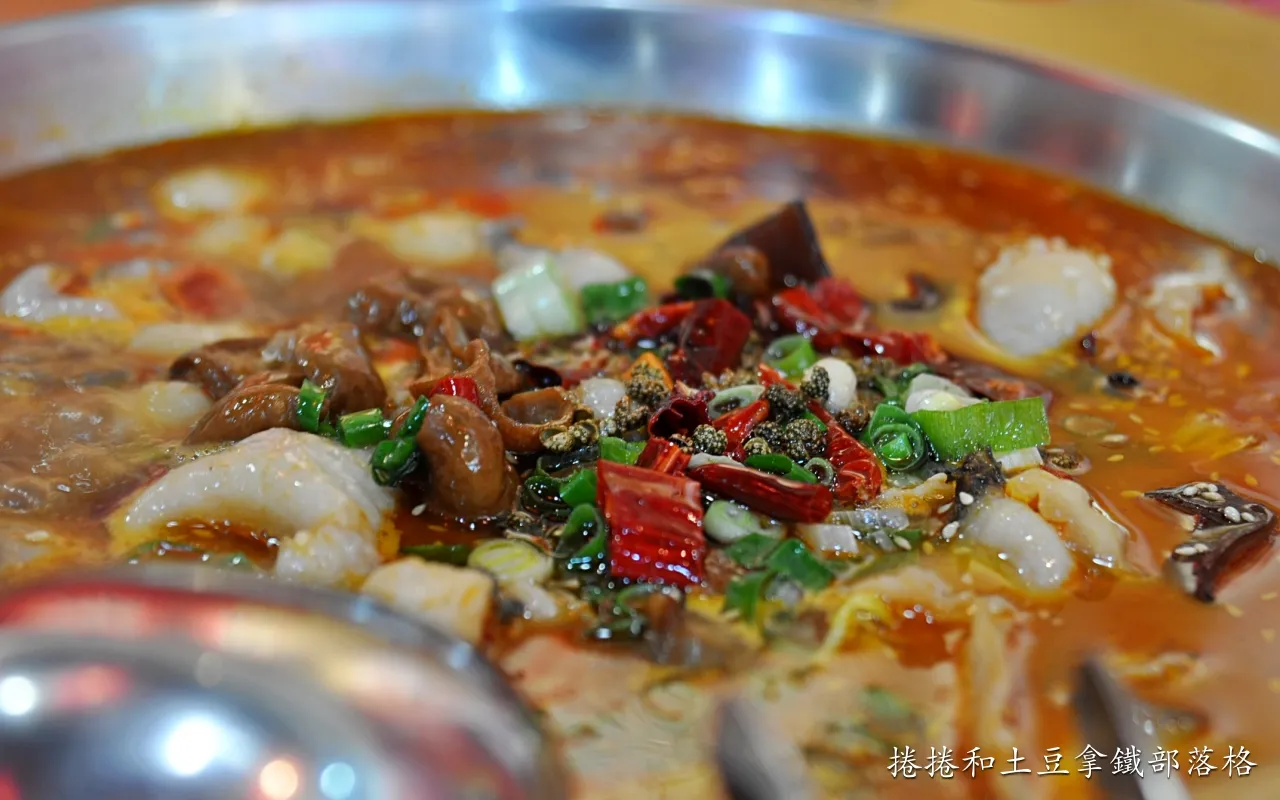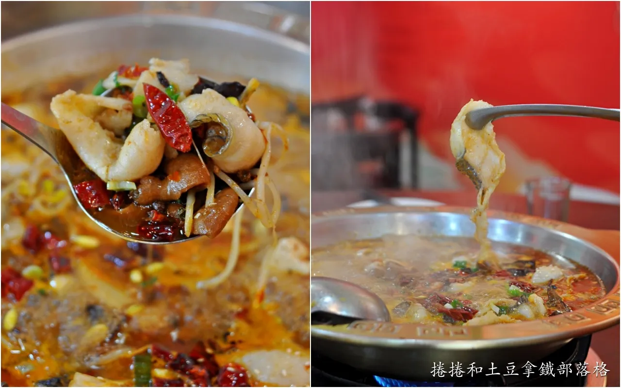 一上桌就看得見的鮮嫩魚片與滷製肥腸,以乾辣椒、花椒、泡椒、豆瓣醬、薑片、蒜頭及蔥段等熬製的香麻辣湯底,湯頭不會過鹹可以喝,剛入口的時候辣味是溫和地在嘴裡散開,咽下去後尾韻是辛香料的香氣在口腔中,湯頭煮久之後辣度會稍微增加,也可以自行加醬料區的開水。