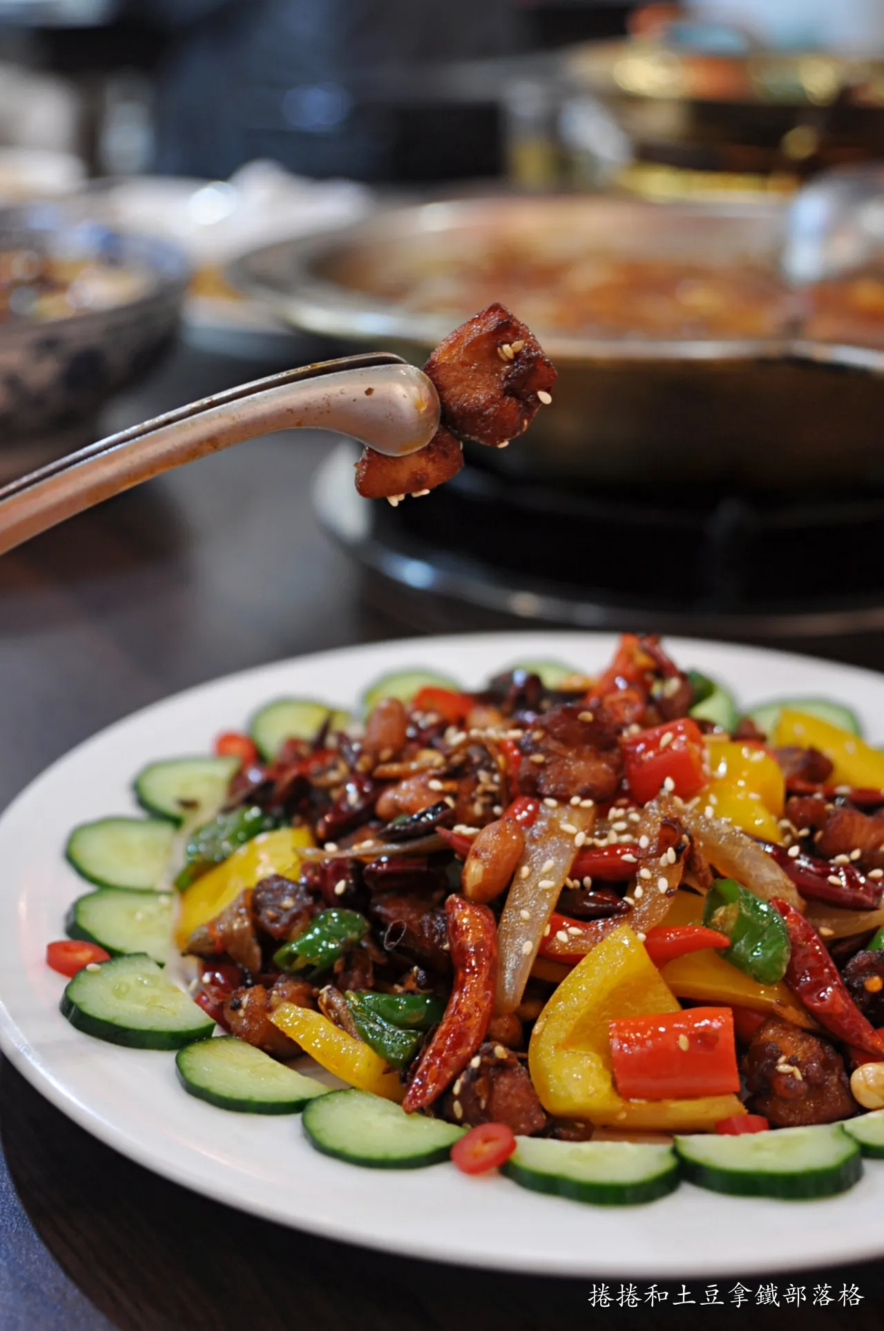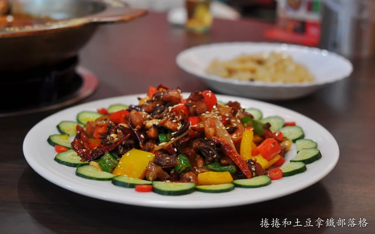 乾辣椒油亮酥脆、雞丁不柴並帶軟骨的口感,盤緣擺上小黃瓜薄片,除了擺盤顏色豐富可愛之外,將辣子雞搭配小黃瓜片一起吃蠻清爽的。