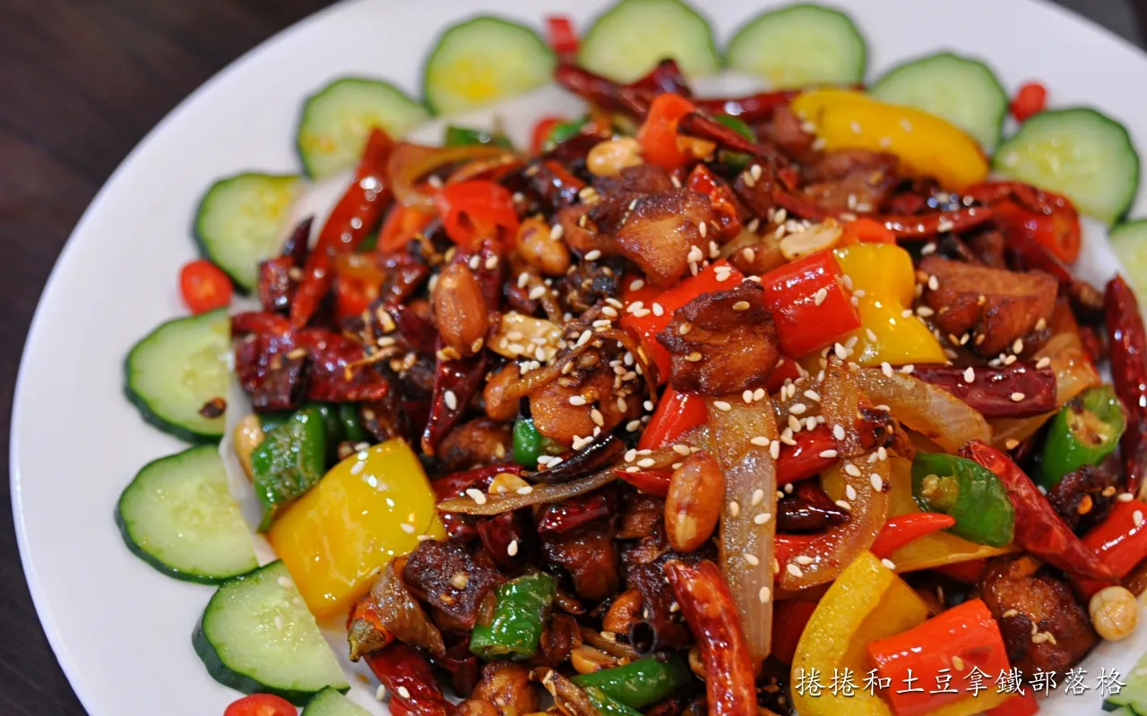 我覺得辣子雞的辣度是目前最溫和的菜餚,醃製過的雞丁帶軟骨先炸過處理,再與大量的乾辣椒、花椒、薑蒜爆炒,配上彩椒、洋蔥、花生一起烹調,最後撒上白芝麻,很適合來罐啤酒!