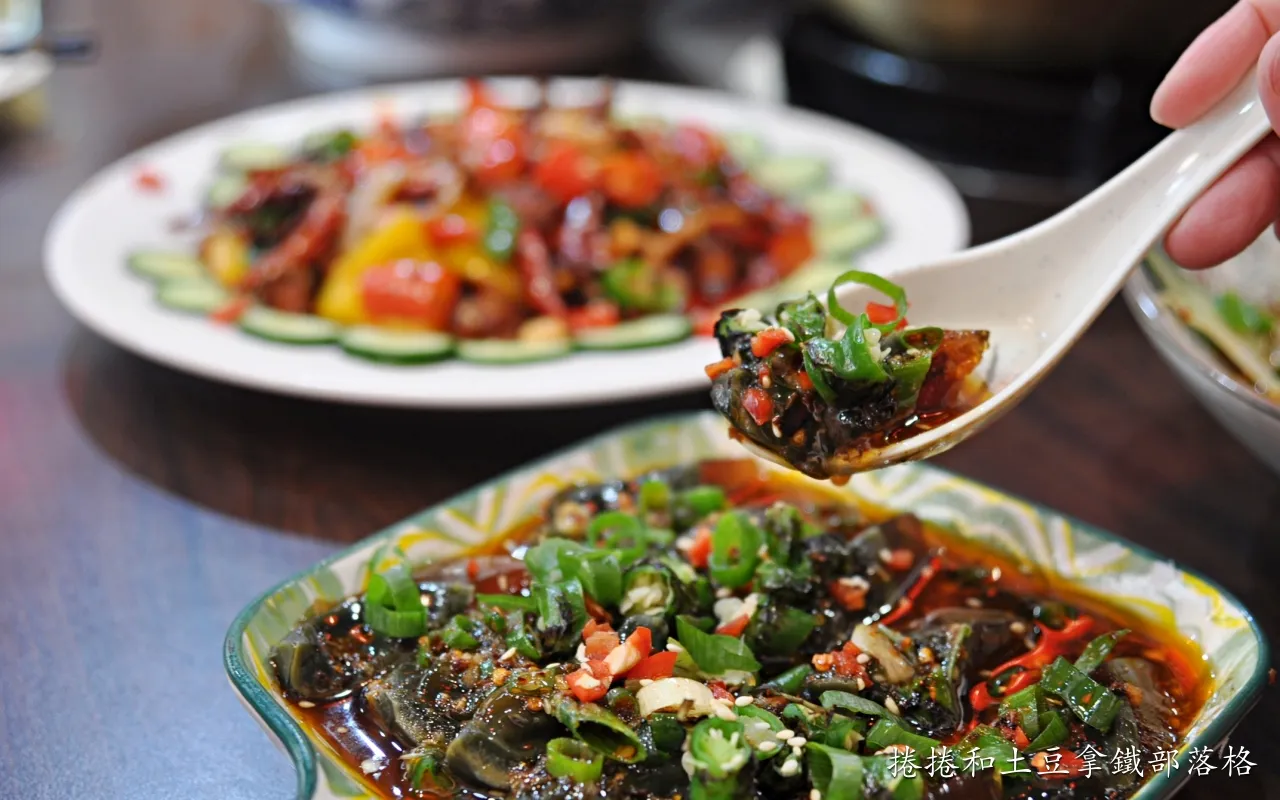 千張是一種含水量較低的豆製品,高植物性蛋白、低醣、低熱量,前陣子生酮飲食流行時常會被用來取代麵粉皮。這道涼拌千張加入黃豆芽、青蔥與黃瓜,切成像麵條般的形狀,拌入特調醬汁。第一口吃下去是花椒帶來的麻感,慢慢的才會感受到辣味,麻>辣的一道涼拌小菜。