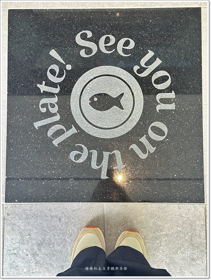 入口處有塊超有戲的大理石地磚!上面有隻小魚🐟,旁邊還寫著 「see u on the plate」。