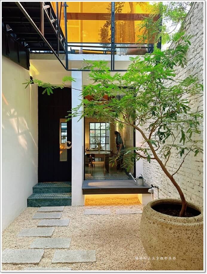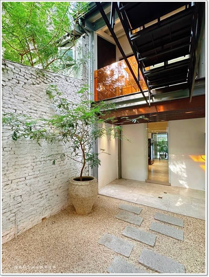 中間還有個小小的露天庭院,陽光灑下來,樹影輕輕搖曳,光線跟玻璃折射出一種夢幻的光影變化,完全像在拍電影。