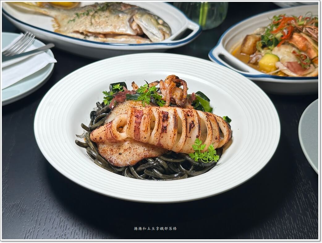 這道菜的靈魂就是 墨魚醬+烏魚子+烤中卷,再撒上一點花椒提味。
