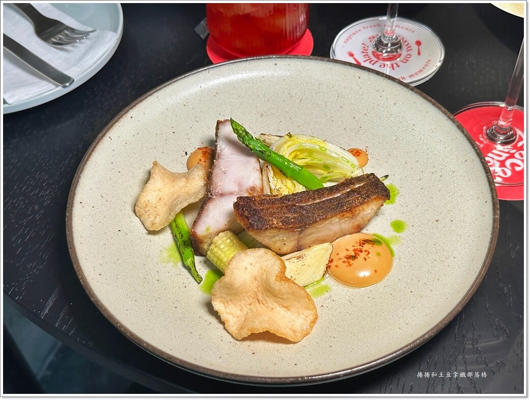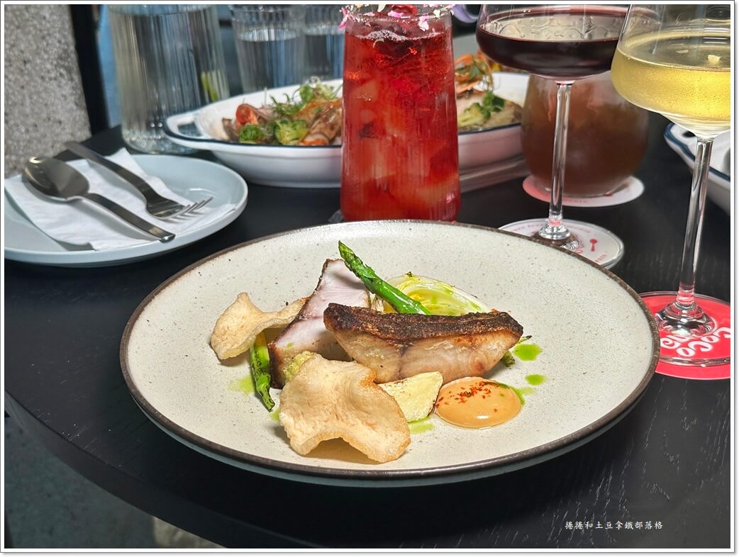 蕃茄、酸豆、黑橄欖、紅心橄欖,這些來自地中海的元素在盤中交錯,組成一種酸、甜、鹹、香的平衡。每一口魚肉都被醬汁輕輕包覆,黃金鯧的鮮甜在酸豆的刺激下更顯清亮。