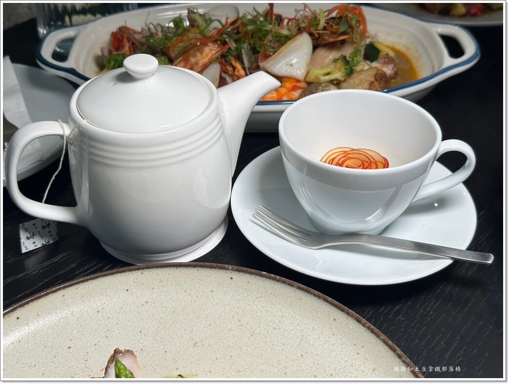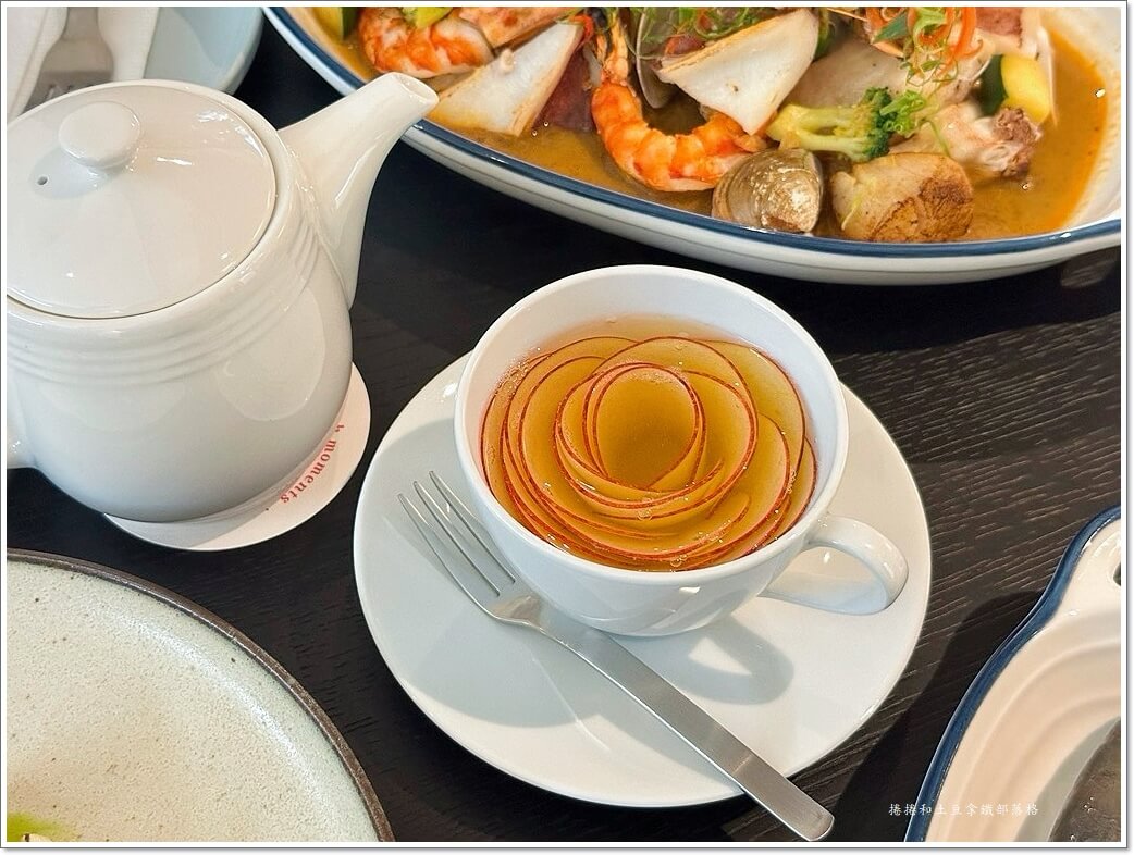 這杯飲品一上桌,就先讓人眼睛一亮。蜜漬蘋果薄片被細心捲成花苞的形狀,當熱騰騰的覓香龍眼花茶沖入那一刻,蘋果花慢慢綻放開來,像是小小一場表演。