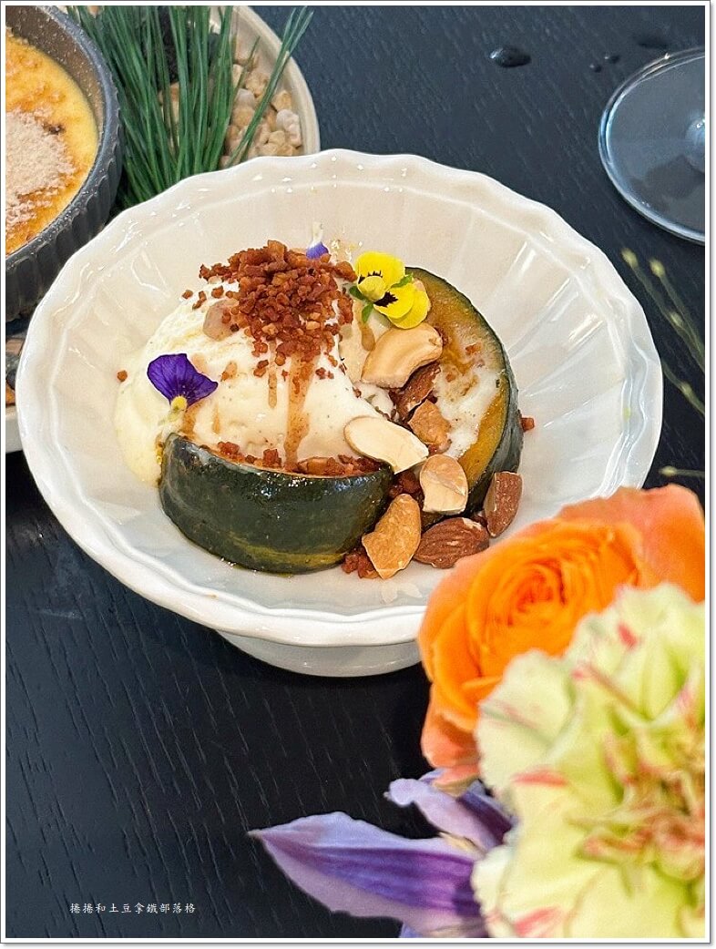 熱烤的 栗子南瓜 上桌時還冒著微微熱氣,香氣濃郁,卻被一球 香草冰淇淋 立刻中和,冷熱在口中碰撞,甜中帶清爽。再加上 鹹焦糖培根、堅果、榛果奶油,甜、鹹、香、脆都齊了,層次豐富卻不複雜。