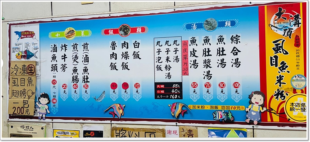 說到這間在鹽埕區躲了超過一甲子的大溝頂虱目魚米粉湯,從1959年就在大溝頂市場紮根了,早年是為了給碼頭工人和市場攤販補體力用的,所以份量給得像怕你剛從荒島回來一樣。它最厲害的不是別的,是那個別處吃不到的裹漿魚肚,把新鮮虱目魚肚外面裹上一層厚厚的魚漿,把魚肉的鮮甜通通鎖死在裡面,口感紮實。再加上那種南部特有的粗米粉,長得像米苔目卻更有咬勁,整碗湯頭清甜得像剛從海裡撈上來。