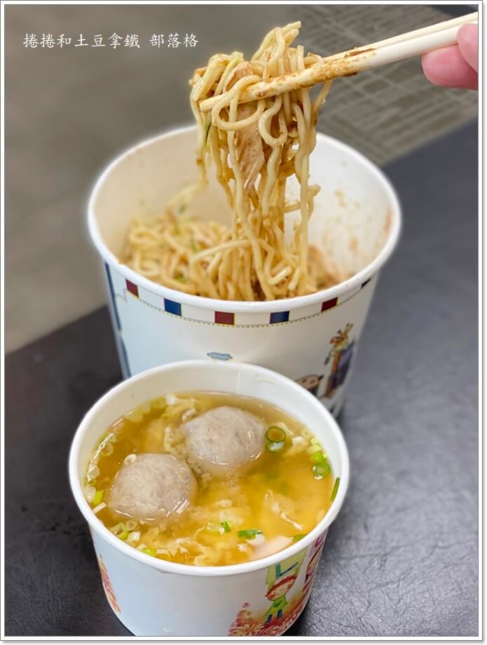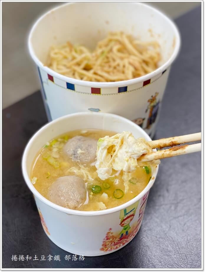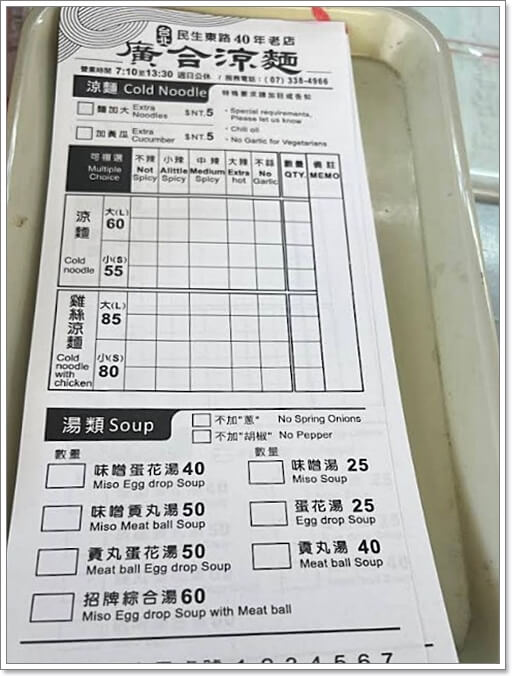 因為涼麵傳承自台北,據說台北人吃涼麵最愛搭這碗綜合湯,裡面有味噌、蛋花、貢丸,這是南部比較少見的組合。