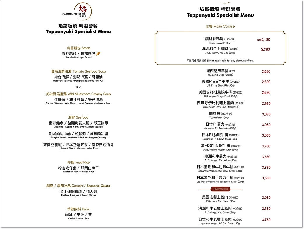 焰 鐵板燒 2025年六月最新菜單將台灣各地的當季、有機食材融入鐵板料理,為饕客呈現獨一無二的季節限定美味。最特別的,是這裡的主菜選擇,不論是美國安格斯牛,還是澳洲和牛甚至不吃牛的朋友也能選擇櫻桃谷鴨胸伊比利豬上蓋肉,種類豐富。