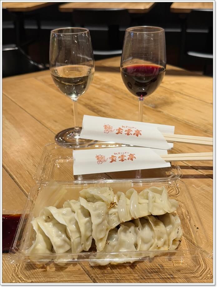 這家「宝雲亭(ほううんてい)」是我這趟福岡行中,被好友的日本朋友“強力推薦”的。她的日本朋友語氣堅定到像在發誓:「我每次來到福岡,就一定要吃這一間!」那種“人生沒吃這間會遺憾”的程度,因為這位住在東京的日本朋友本身就很喜歡吃餃子,所以福岡的餃子店她已經吃過無數家,但唯有這一間,是她的最愛。於是有一天晚上,我們肚子雖已經很撐,但仍決定外帶一份回飯店當消夜,邊吃燒餃子,又可配紅酒,太快活了。
