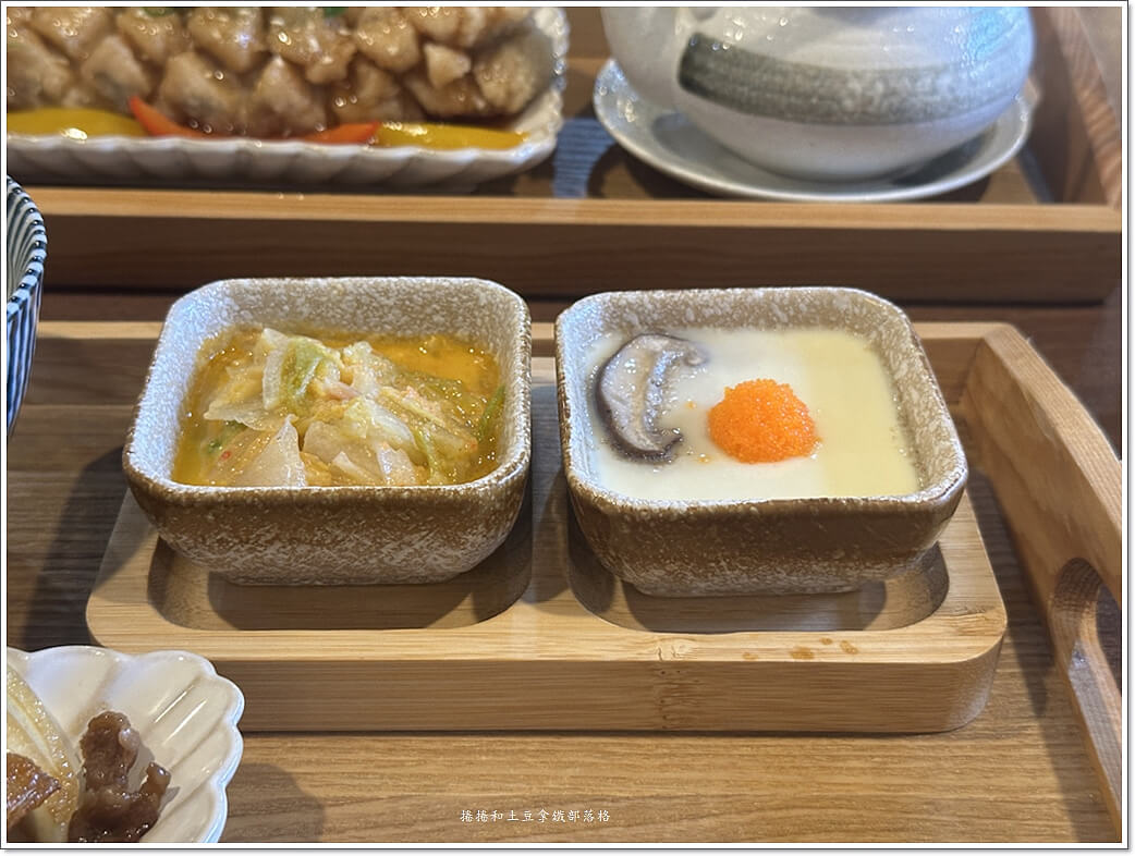 兩道精緻小碟,當天附上的小菜是黃金泡菜,還有蝦卵蒸蛋。蒸蛋表面平滑,像是把布丁鋪平後輕輕放上一層細細的蝦卵,是整套餐裡視覺上柔和的一道配菜。