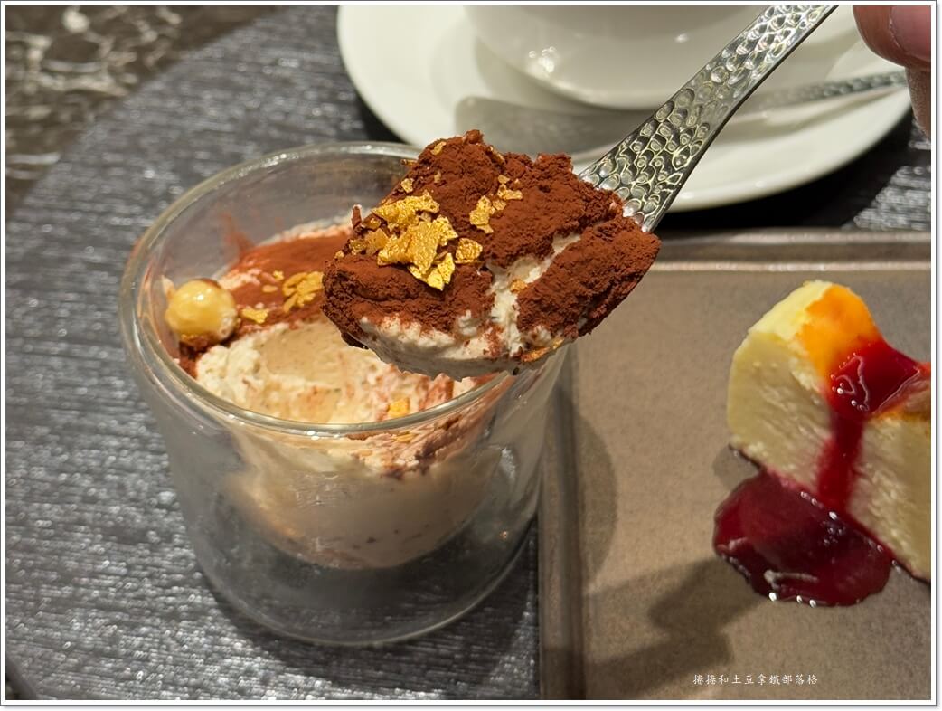 「琥珀茶香・栗子生乳慕斯」奶香順滑、茶韻悠長,中間還藏著蜜栗子小驚喜。底層是鹹香餅乾碎,剛好中和甜味。上面灑著榛果粒跟金色雪花,一口下去,整個人心情都變好了。完美收尾,沒有人不愛。