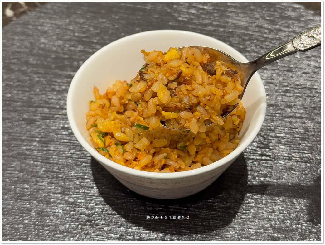 這炒飯挺特別的,使用葉黃素雞蛋,日本牛筋先在鐵板上煎得外酥內嫩,香氣撲鼻。飛魚卵咬下去還會彈跳一下,增加口感。整盤吃下來,炊香和海味鹹鮮混在一起,讓人一口接一口。
