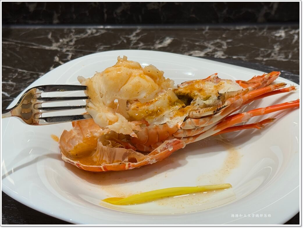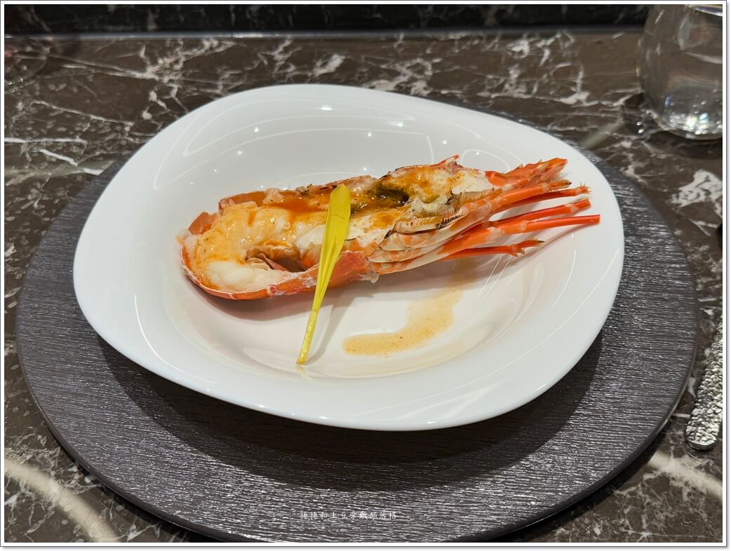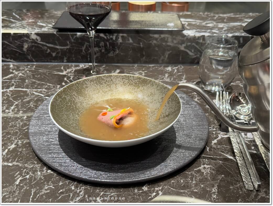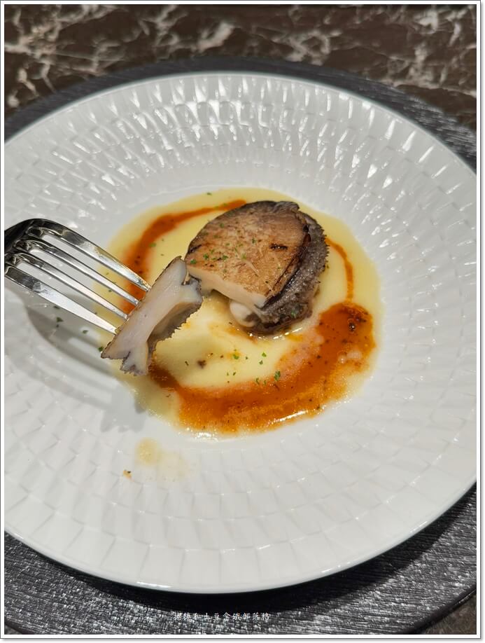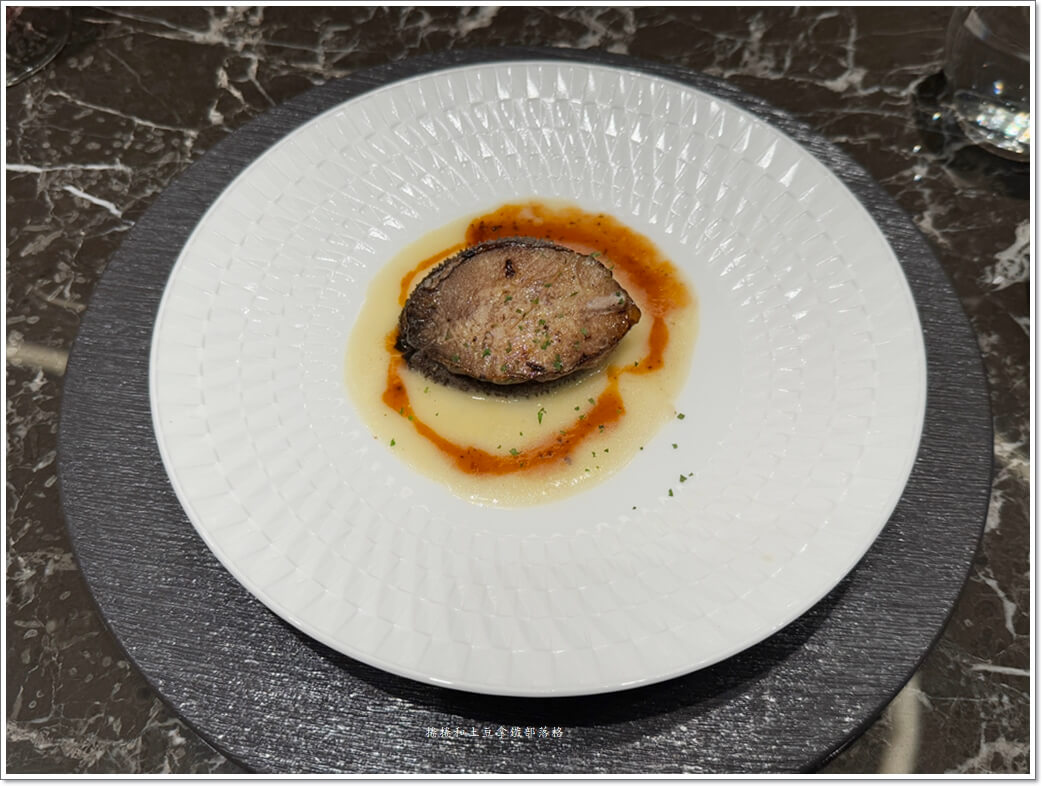 這道南非活鮑很有戲,鮑魚活跳跳上桌,先用白蘭地香煎,香氣就先撲鼻。再淋上主廚自製的松露波特醬,慢慢熬了四個小時,帶點法式奢華感。入口時鮑魚鮮嫩又有彈性,醬香繞舌,讓人忍不住想說:「欸,好好吃喔!」
