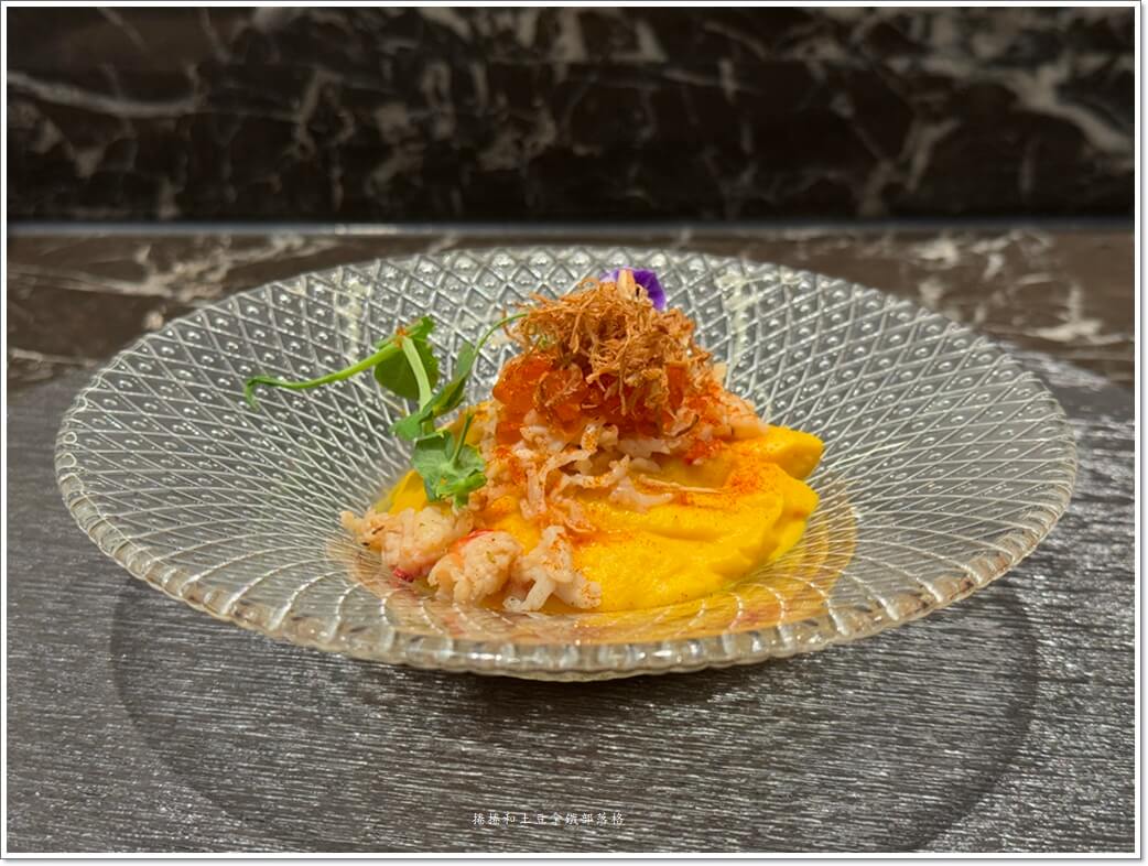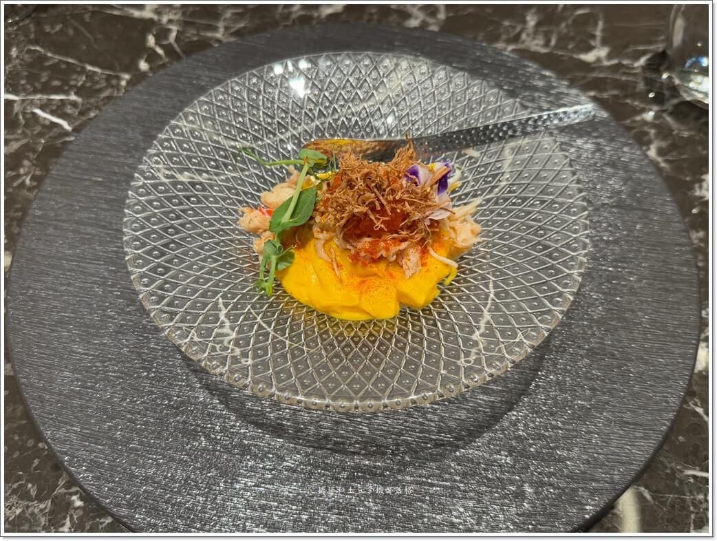 底下鋪著南瓜泥、蘋果丁和柚子果肉。上面放了帝王蟹和跳跳鮭魚卵,再撒點酥炸薑絲,海味、果香、微辛一次撞擊味蕾。一端上桌,色彩漂亮吸睛,肯定是手機相食的料理。