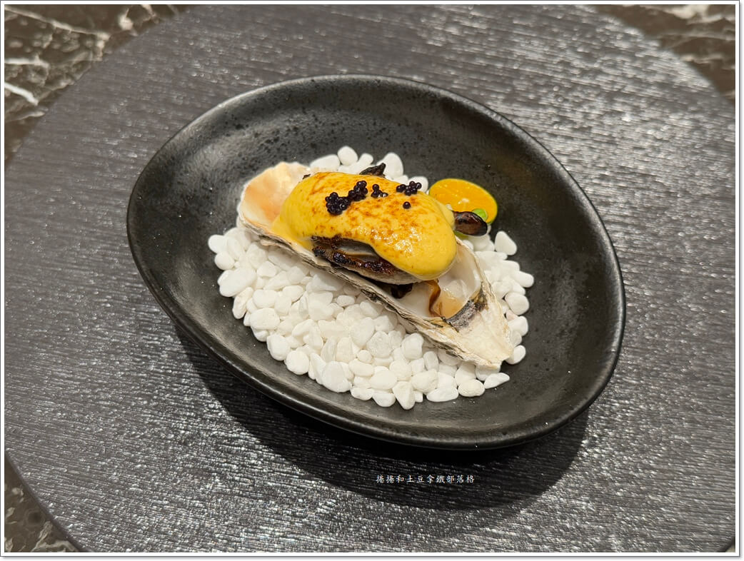播磨生蠔煎得金黃香脆,搭上滑順的海膽荷蘭醬,頂上點一點魚子醬,吃起來有海味的鮮甜。