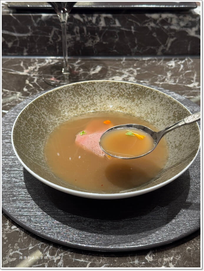 這道菜很簡單,卻有點小心機。芋頭做成慕斯,軟綿甜香,搭配煙燻鴨肉片,一入口就有淡淡的煙燻味。牛肝菌和鴨架慢火熬的清湯,在你眼前現沖,香氣馬上飄開,帶點野菇的氣味,又混合鴨油的溫潤,好像秋天的霧氣慢慢散開。