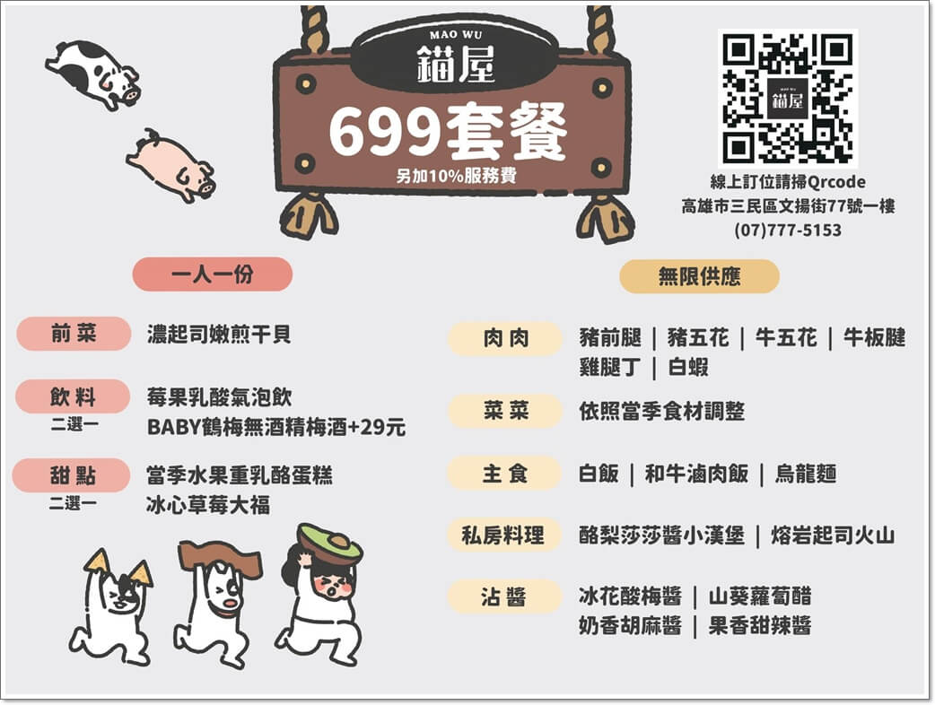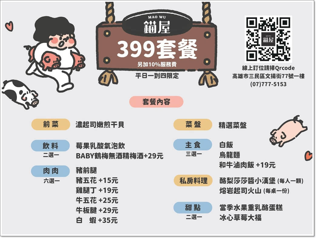 高雄市三民區文揚街77號。07 777 4174。訂位 https://lihi2.cc/Gceb3。用餐時間100分鐘,用餐後60分鐘最後加點。