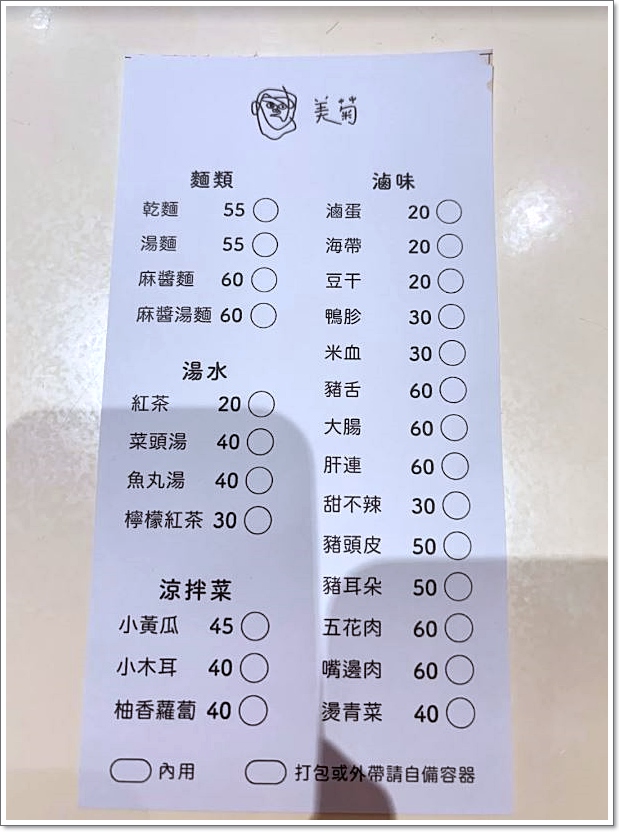 但別以為美菊只是賣臉的,這麵店可是以店主阿嬤的名字命名的。店裡賣的是紮紮實實的乾麵、麻醬麵,還有滷味。