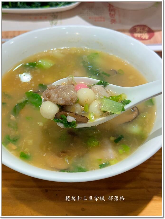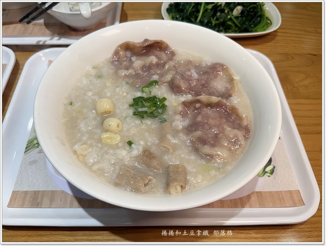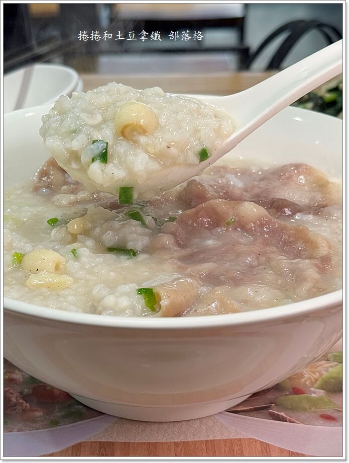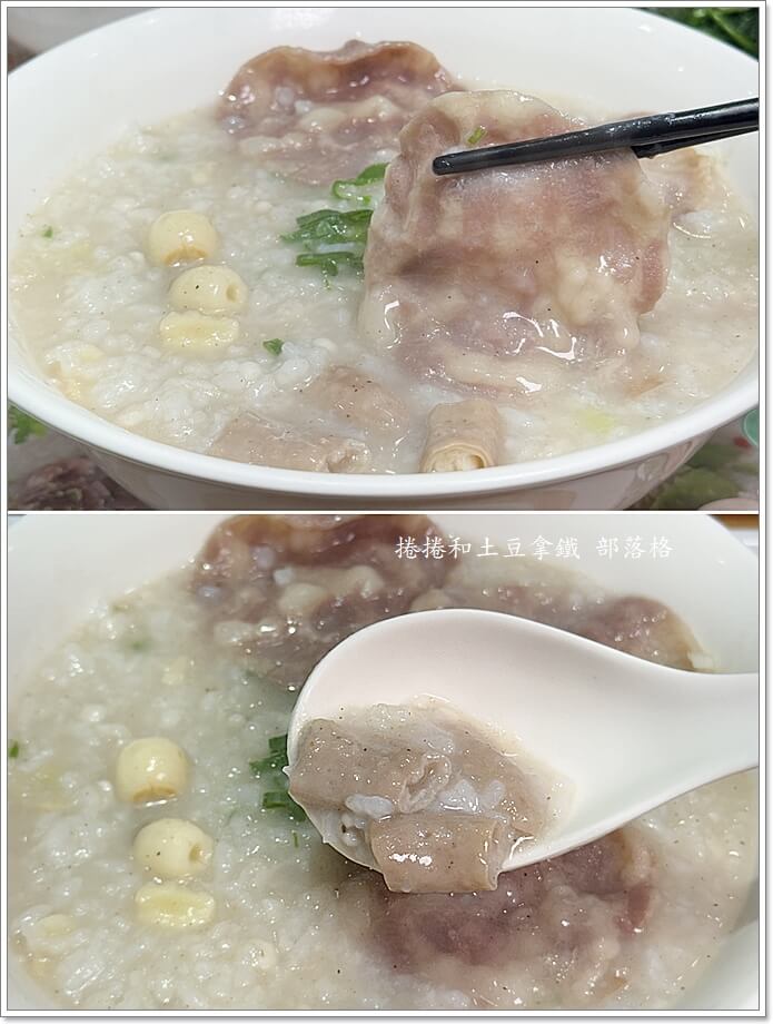 它巧妙地把粥融入四神湯的概念,裡面有豬肉片、蓮子、薏仁和處理得很乾淨的豬小腸。
