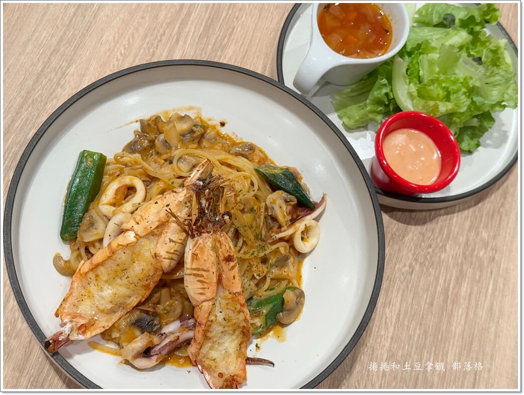 美國醬蝦中卷麵 附小沙拉、蔬菜湯