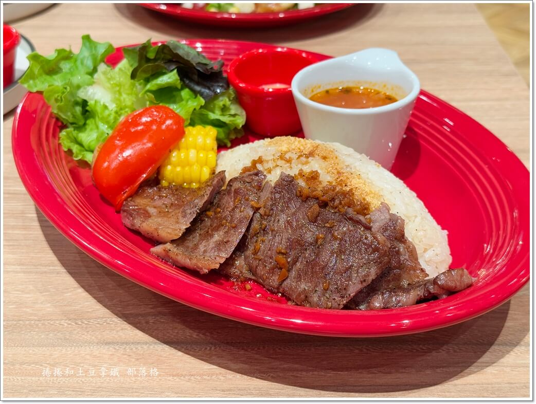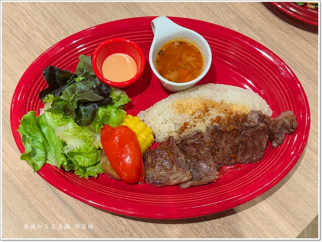翼板牛排本身煎得剛剛好,外層焦香、裡面還保留嫩度,旁邊那碗香蒜飯,是拌入香蒜粉,吃起來更有味道。