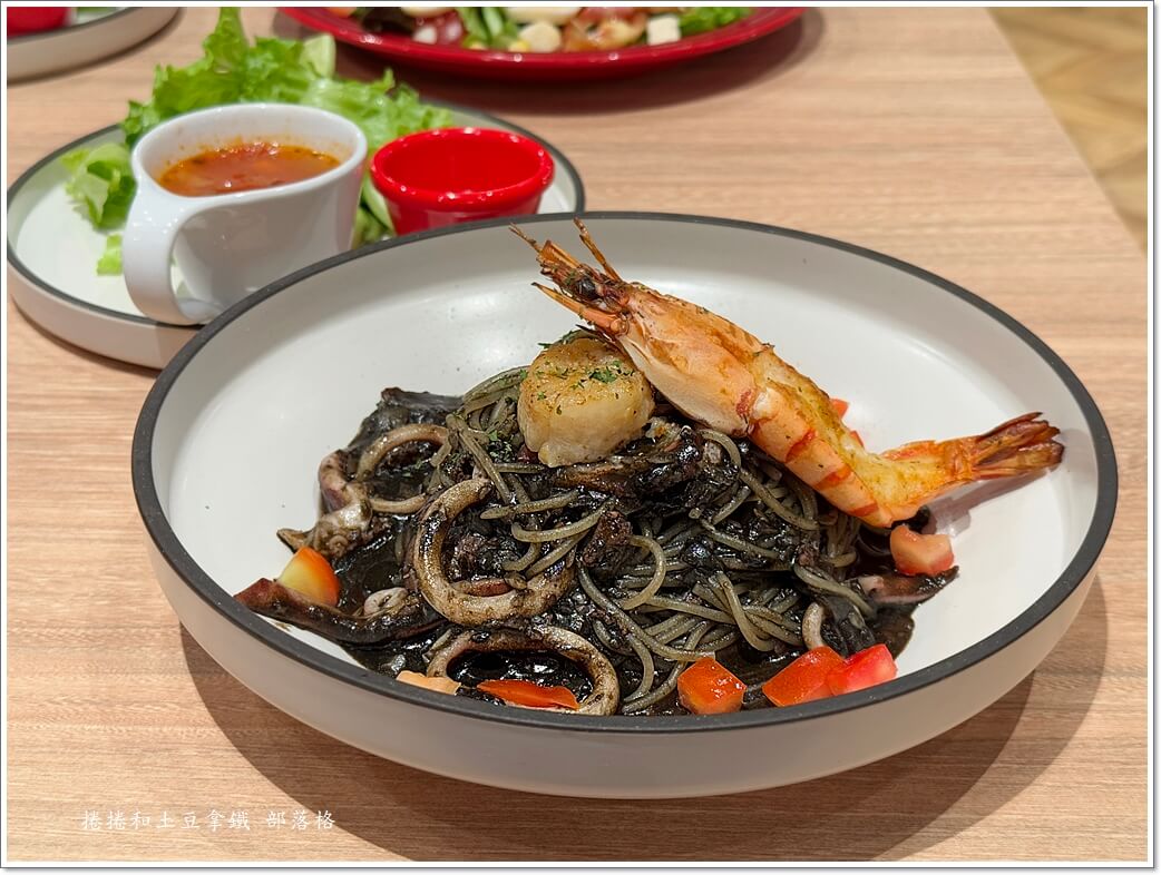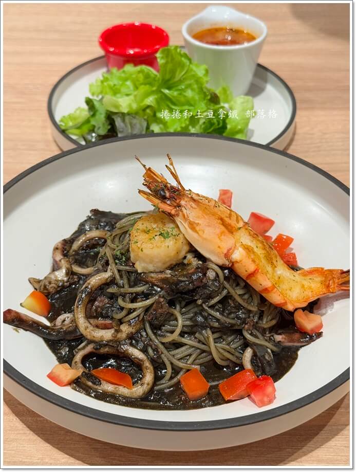 干貝蝦烏賊墨麵 附小沙拉、蔬菜湯