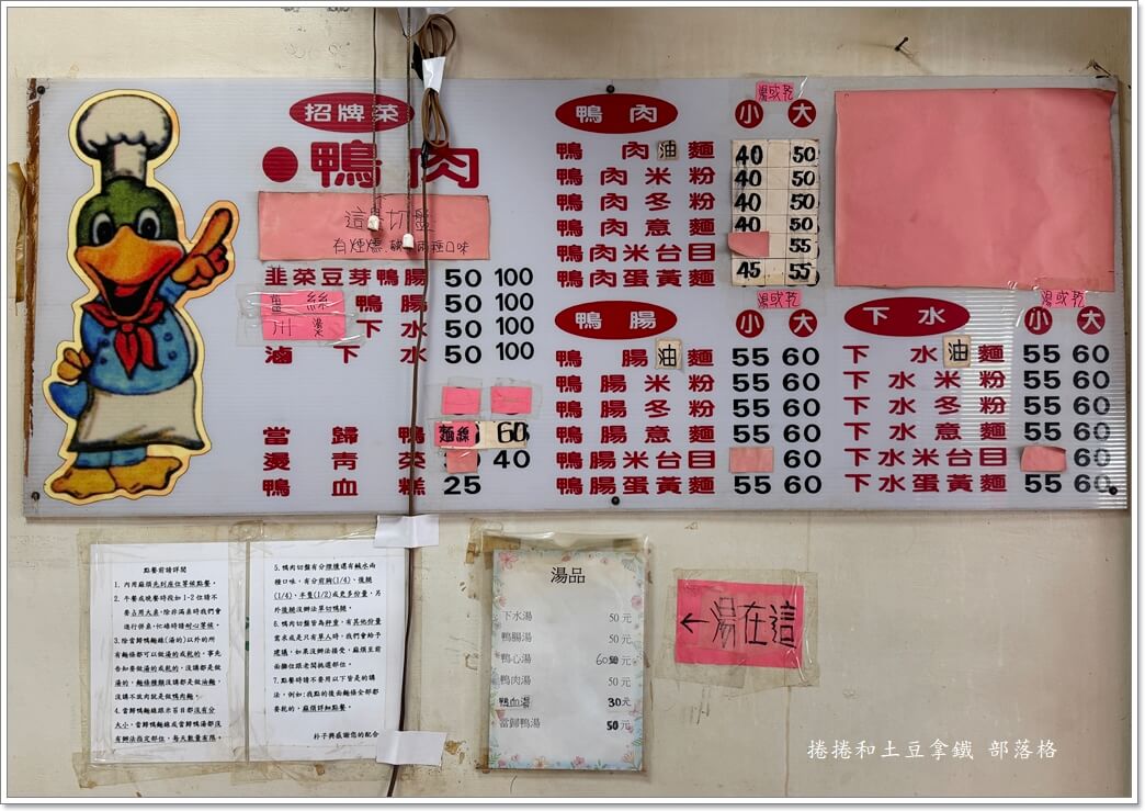 價目表。鴨肉切盤會依照份量稱重計價。招牌鴨肉切盤有鹽水與煙燻兩種口味