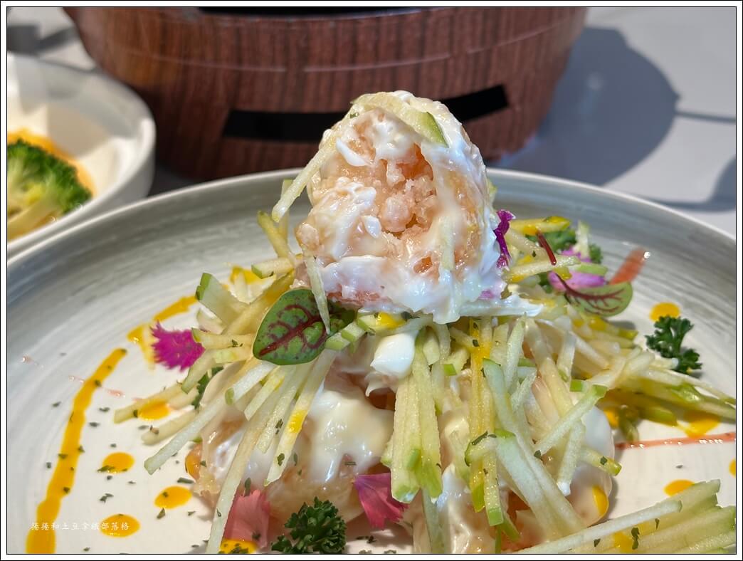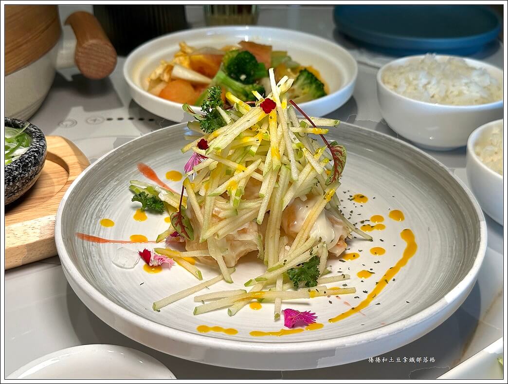 我很喜歡這道,乍看以為是青木瓜絲,原來是蘋果切細長條,脆脆的搭配超大顆蝦球,裹上美乃滋基底,那種果香直接平衡了炸物的厚重,真的會讓人忍不住一顆接一顆。