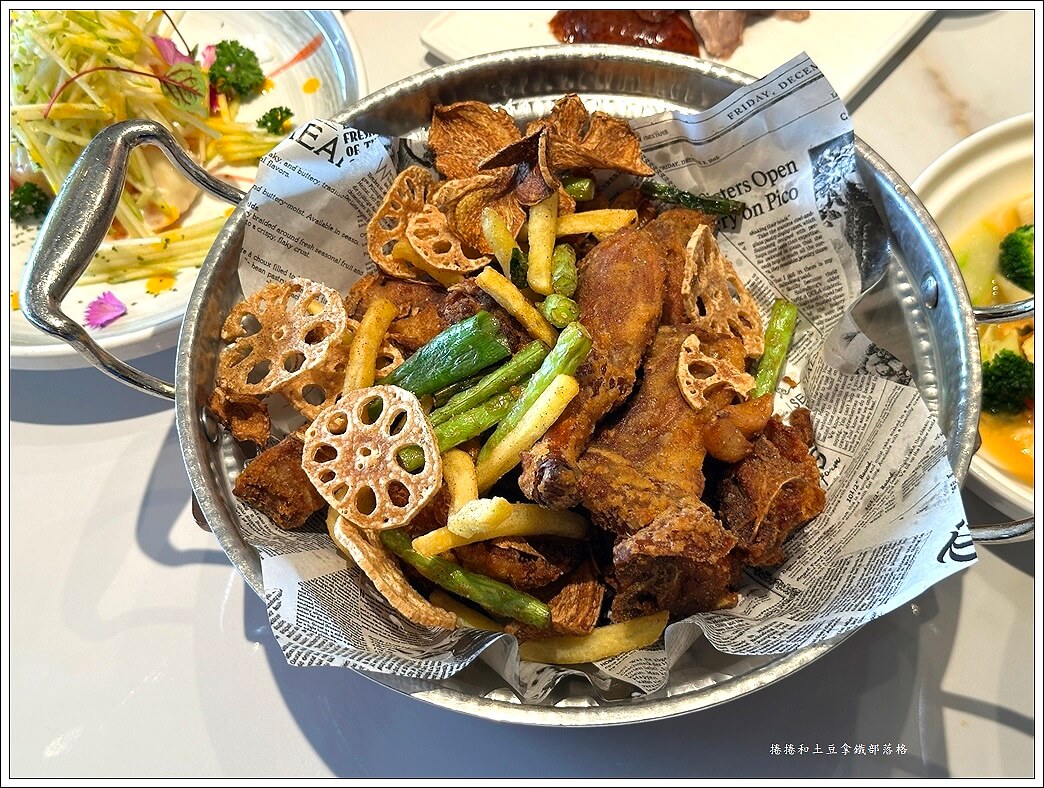 這道菜一上桌,那個香味簡直是公然誘惑。主廚把片皮後剩下的鴨架切塊,在高溫油鍋裡炸到連骨頭邊邊都酥脆迷人。入口那個鹹香脆勁,鴨肉縮得緊實卻不柴,鹹香的味道滲透進骨縫裡。