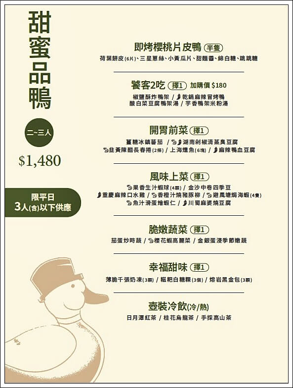 2026/1/19 起推出全新改版、2-3人就能開吃的「甜蜜品鴨套餐」,整套只要 NT$1,480。