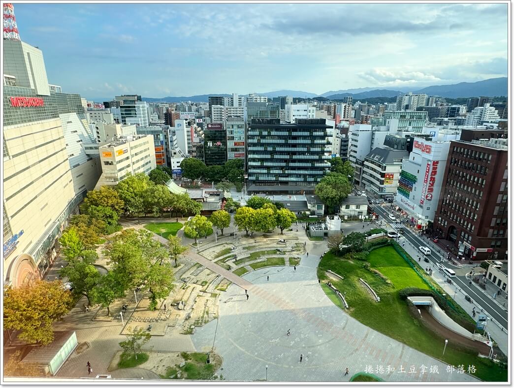 從客房看出去的景色,視野相當不錯,前方就可以看到警固公園,順便可以去藍瓶咖啡吃早餐。