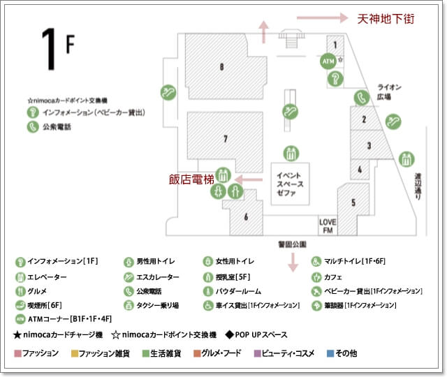 ▼下圖是索拉利亞廣場(Solaria Plaza)1F的平面圖,福岡索拉利亞西鐵飯店的電梯位置,位在左下角。右邊是往地下街,下方是往警固公園,也是Solaria Plaza的正式大門。