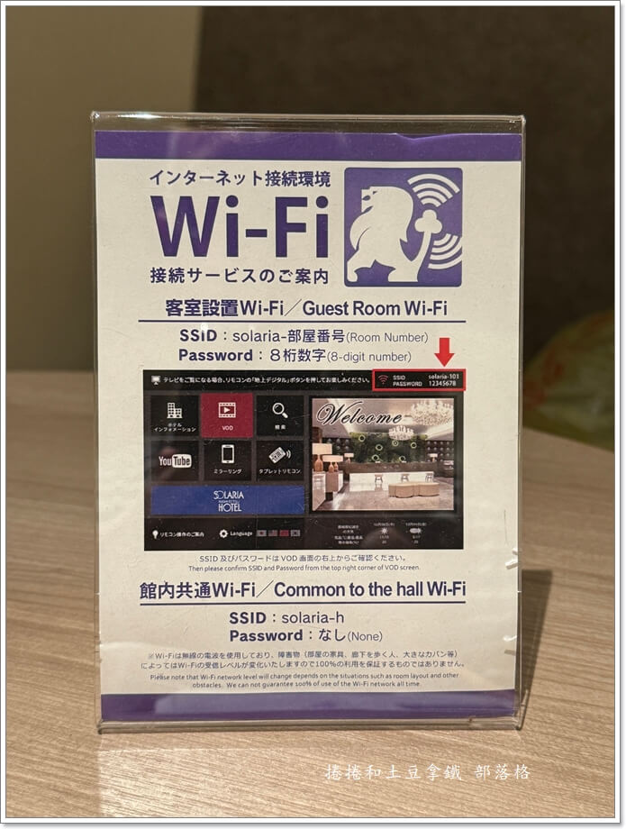 房間有免費WIFI,密碼在電視螢幕的右上方。