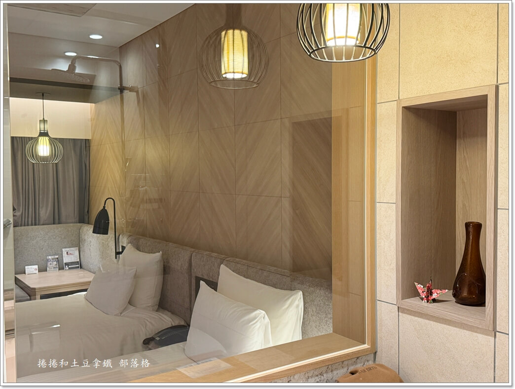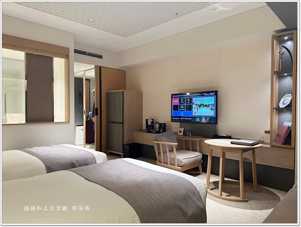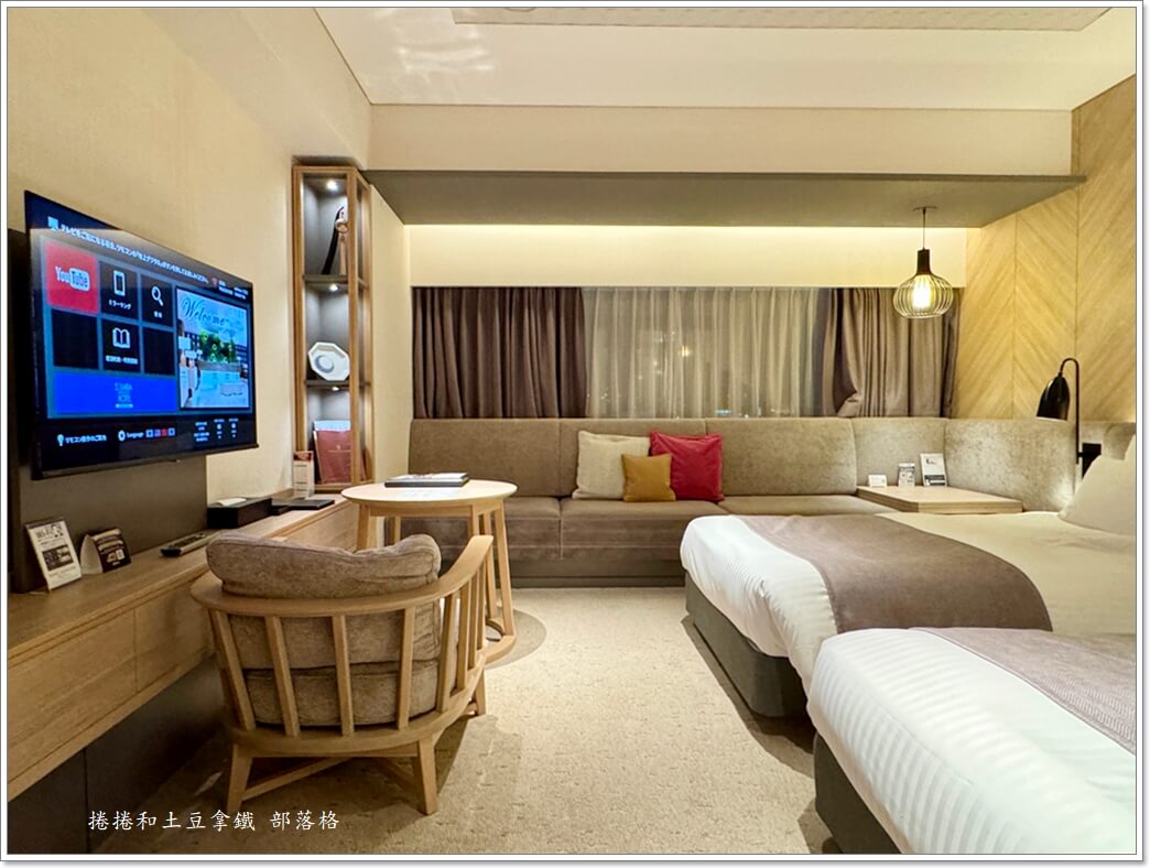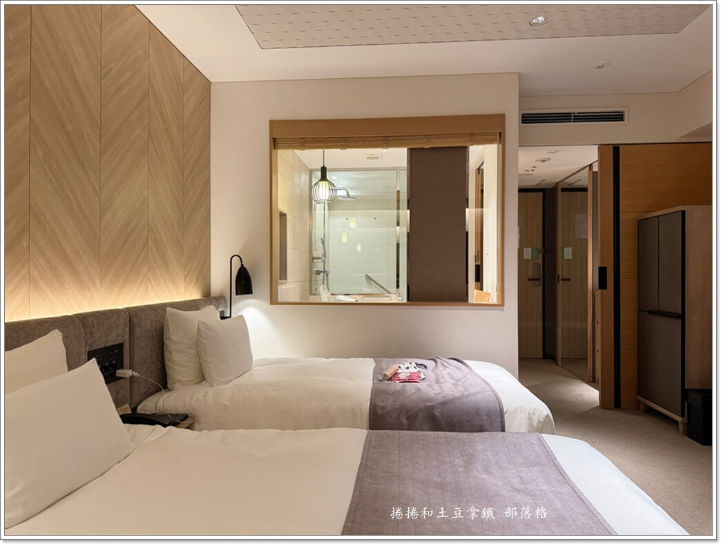 我們這次特別選了空間大一點的房型(市景高級房/兩張單人床/28平方米),位在這層的角落房間,裡面有一張長沙發,那種一坐下去就會懶到不想出門的等級。😌坐在那裡滑手機、喝咖啡、放空,整個人瞬間變成福岡版貴婦。