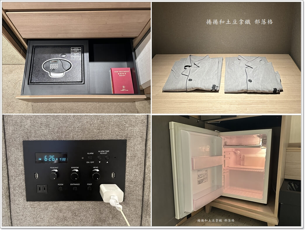 ▼提供有保險櫃、小冰箱、睡衣。床頭插座(有USB插座),整個房間插座數量很足夠。