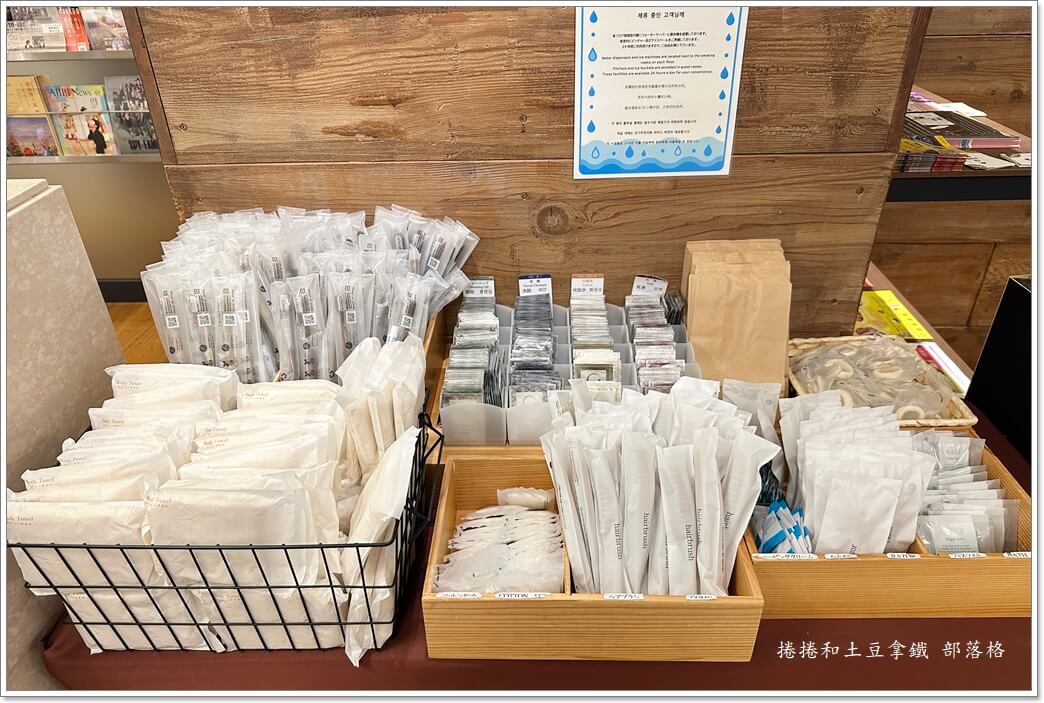▼飯店在大廳電梯旁,提供許多一次性的備品。挺貼心的地方是提供紙袋,你要什麼就自行拿取。有沐浴鹽可以泡澡使用。