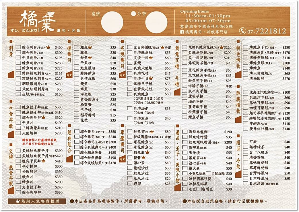 劃好單號自行到櫃檯點單結帳。菜單上有生魚片、丼飯、握壽司、軍艦壽司、炙燒壽司、手捲、花捲,還有烤物、湯品、甜點。