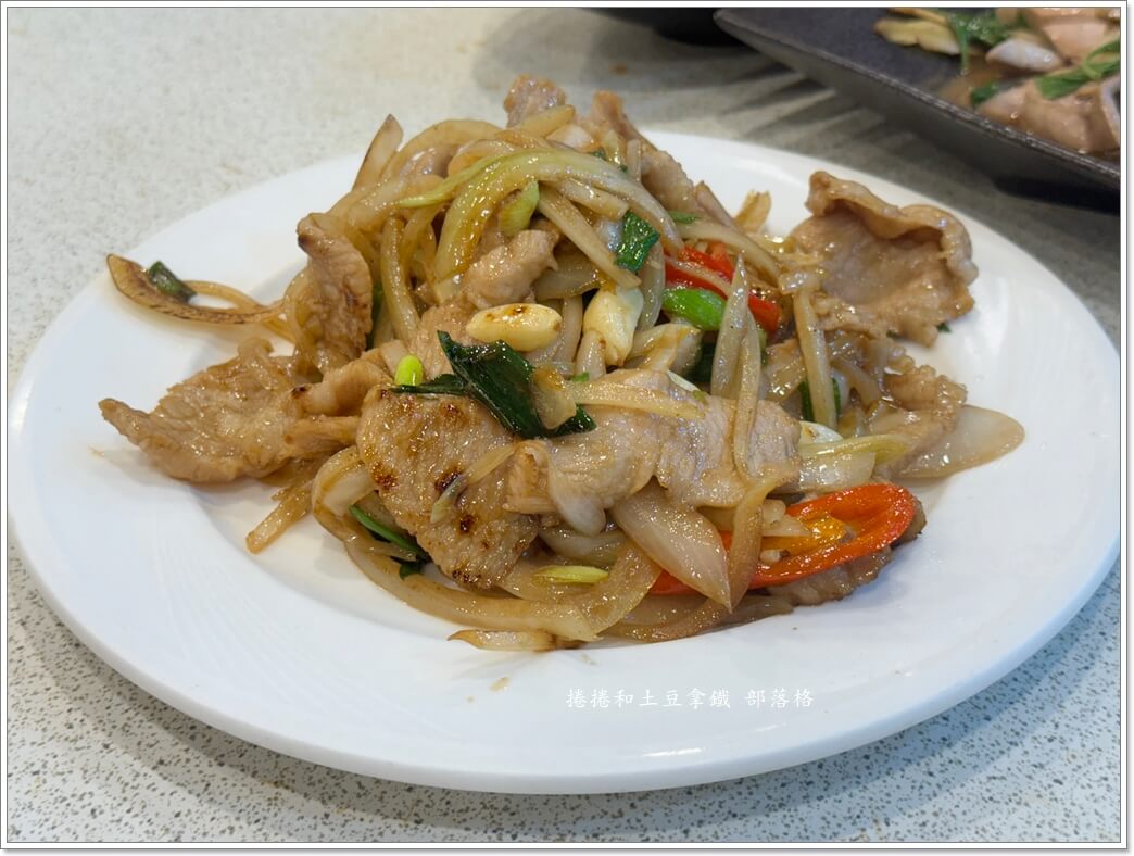 蒜苗松阪豬。松阪豬肉片爽脆,但切得太大塊,反而咀嚼度偏辛苦,蒜苗雖香但分量太少,幾乎都是洋蔥為主,火候掌握剛好不油不膩。