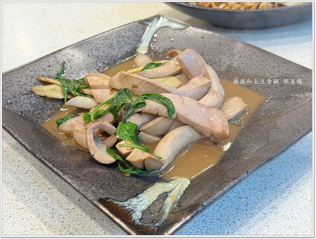 花菜干炒蛋,鹹香乾爽的花菜干與嫩蛋一起拌炒,是很有古早味的組合。不過不知道什麼原因,菜餚上桌時已經冷掉大半,可惜了!
