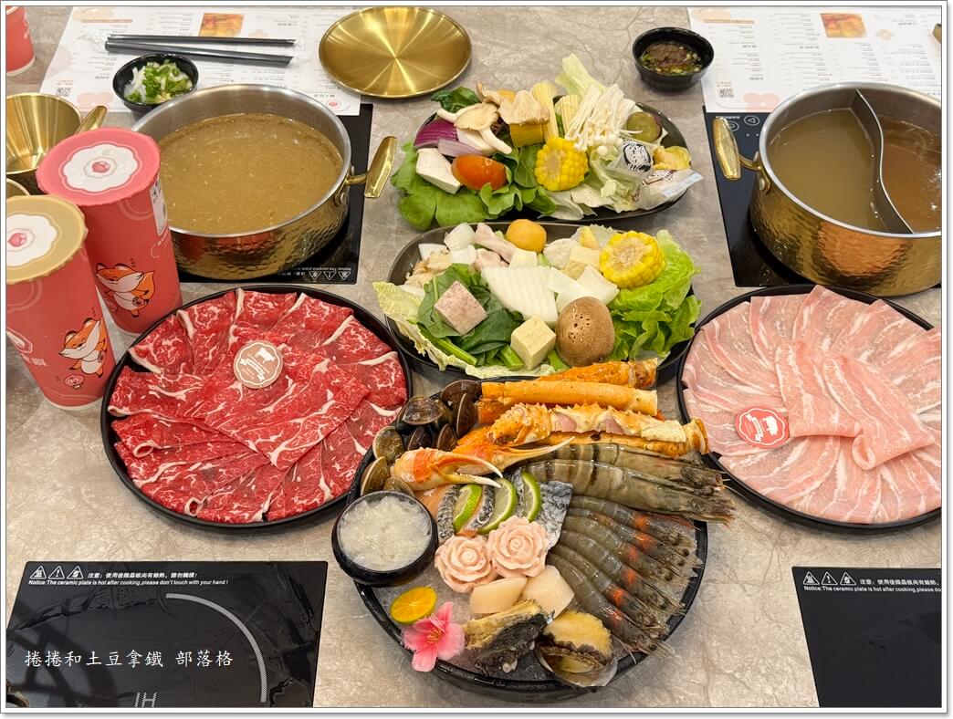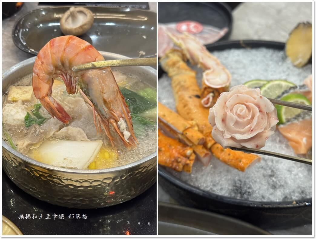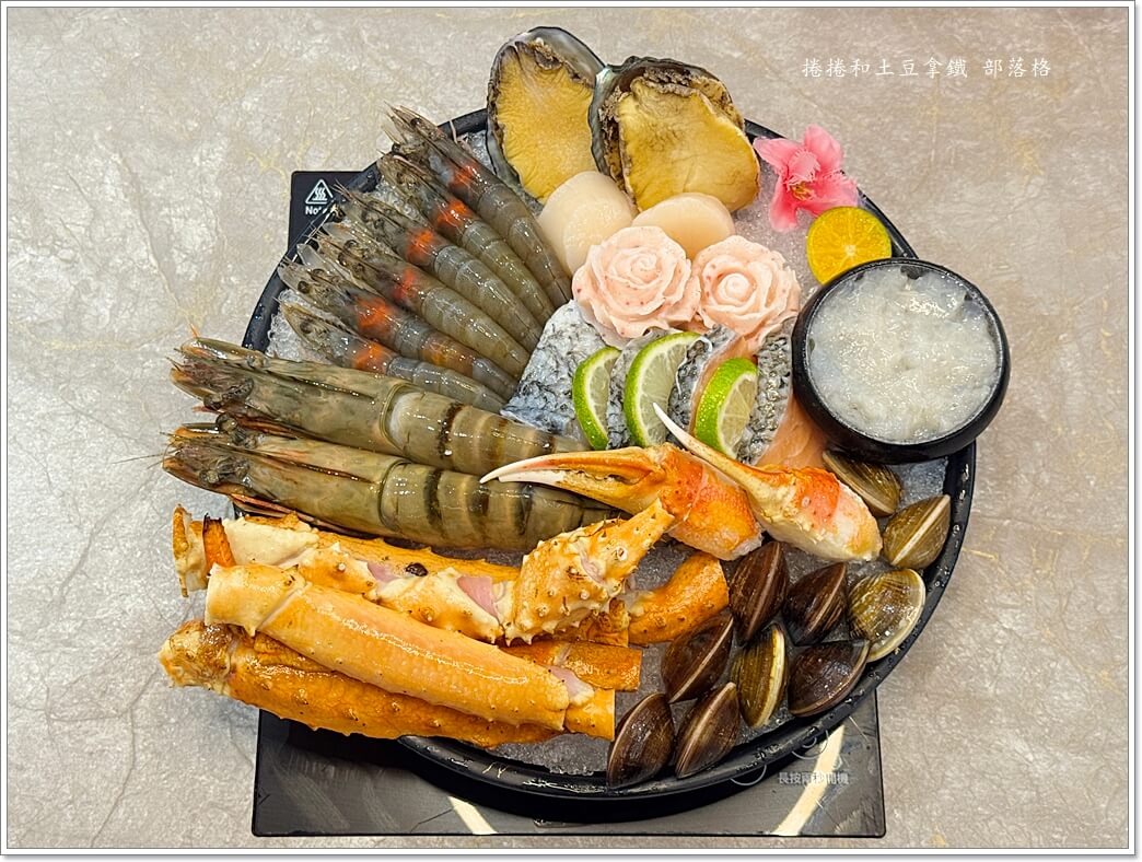 海鮮更是走豐盛路線,帝王蟹腳、松葉蟹鉗、大草蝦、白蝦、鮮蝦漿、日本干貝、鮑魚、國王鮭魚、金目鱸、蛤蜊,連鱈魚玫瑰花都有,基本上是把大家愛點的海鮮一次幫你配好。