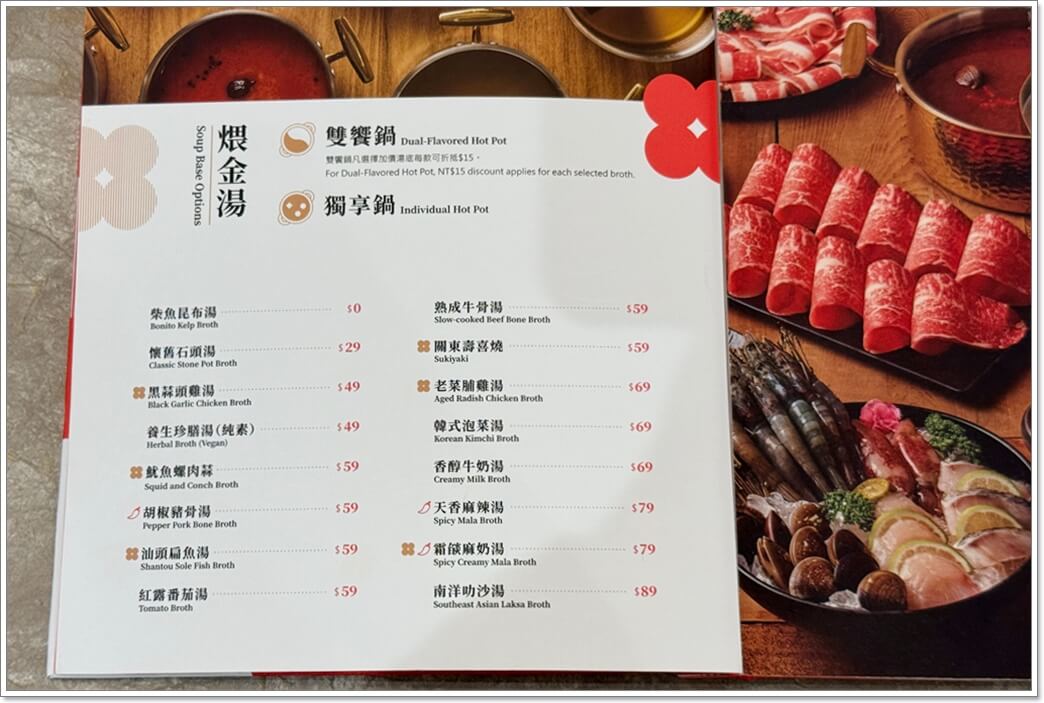桃金鍋物雖然都是個人鍋沒錯,但就算一個人來,也可以直接點鴛鴦鍋。而且他們的湯頭選擇真的很多,總共16種。